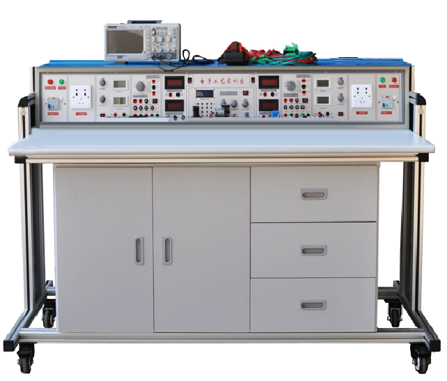 實訓(xùn)主機箱箱體采用鐵質(zhì)雙層亞光密紋噴塑結(jié)構(gòu),鋁質(zhì)面板。左邊是安全控制、交直流電源、信號源、測量電表等;主機箱控制面板左右及頂部配有多組外部儀器交流工作電源插座。