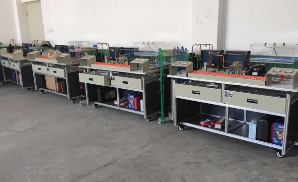 系統(tǒng)由兩部分組成,分別為:分體式熱泵空調(diào)和直冷電冰箱,分體空調(diào)可進(jìn)行制冷、制熱、除濕、自動(dòng)工作模式功能,直冷式電冰箱可進(jìn)行冷藏、冷凍等功能,涵蓋了制冷專業(yè)中所涉及的安裝、管路設(shè)計(jì)焊接技術(shù)、接線、保壓、檢漏、抽真空、充注制冷劑、制冷劑回收、運(yùn)行調(diào)試,控制電路故障考核等。本裝置應(yīng)適合機(jī)電、動(dòng)力工程類專業(yè)的實(shí)訓(xùn),適合制冷及相關(guān)專業(yè)的中級(jí)、高級(jí)工的技能鑒定及考核。