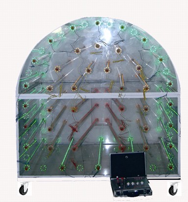 該裝置通過仿真巷道,顯示斷面的炮眼布置方式(掏槽眼、輔助眼、起底眼、周邊眼和水溝眼),炮眼形狀及空間位置。用無藥雷管、藥卷、水炮泥和炮泥,讓學(xué)員觀察其結(jié)構(gòu),并實(shí)際操作裝藥方法(正向裝藥和反向裝藥)和連線方式(串聯(lián)和并聯(lián)),聲、光、電模擬其爆破過程。