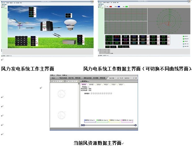 ◆ 顯示內容:蓄電池電壓、風機電壓、光伏電壓、風機電流、光伏電流、風機功率、光伏功率,能量模擬圖,當前風速(米/秒),當前風向(度),當前風力資源平估。