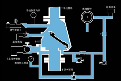 當(dāng)系統(tǒng)處于伺應(yīng)狀態(tài)時(shí),座圈上的溝槽小孔被閥瓣蓋住封閉,通往水力警鈴的報(bào)警水道被堵死;當(dāng)上、下壓力差達(dá)到一定數(shù)值,閥瓣才開(kāi)啟(差壓?jiǎn)?dòng)),水就從供水側(cè)流向系統(tǒng)側(cè),警鈴報(bào)警,滅水系統(tǒng)噴水;當(dāng)上、下壓力頻繁開(kāi)啟,在閥瓣上設(shè)有小補(bǔ)水閥,當(dāng)系統(tǒng)側(cè)管網(wǎng)有微小滲漏或水源壓力有波動(dòng)時(shí),可以通過(guò)補(bǔ)水閥給管網(wǎng)補(bǔ)水,平衡上、下腔壓力,穩(wěn)定了閥瓣,從而避免了誤報(bào)警。