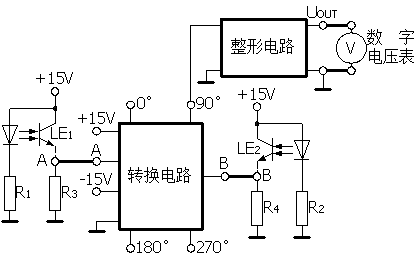 2、圖17-2為測速裝置示意圖,其中微型電動機(jī)帶動轉(zhuǎn)盤在兩個成90度的光繼續(xù)器的開口中轉(zhuǎn)動,轉(zhuǎn)盤上一半為黑色,另一半透明,轉(zhuǎn)動時,兩個光繼續(xù)器將輸出不同相位的方波信號,這兩個方波信號經(jīng)過轉(zhuǎn)換電路中的四個運(yùn)放器,可輸出相位差分別為0°、90°、180°、270°的方波信號,它們的頻率都是相同的,其中任意一個方波信號均可輸出至頻率表顯示頻率。原理如圖17-3所示。