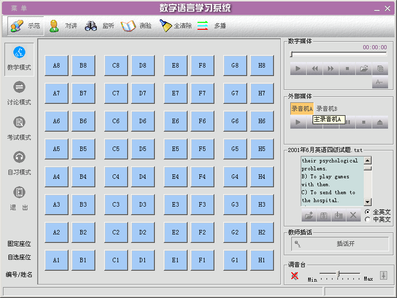 一、語言教室 用語言學習系統(tǒng)或?qū)嶒炘O備來從事語言教學及其研究,或進行語音分析和實驗的場所?煞譃椋 1、用AP型語言學習系統(tǒng)(聲頻被動系統(tǒng))構建的語言教學的場所,稱為AP語言教室; 2、用AA型語言學習系統(tǒng)(聲頻主動系統(tǒng))構建的語言教學的場所,稱為AA語言教室; 3、用AAC型語言學習系統(tǒng)(聲頻主動可比系統(tǒng))構建的語言教學的場所,稱為AAC語言教室; 4、用APV型語言學習系統(tǒng)(聲頻被動可比系統(tǒng))構建的語言教學的場所,稱為APV語言教室; 5、用AAV型語言學習系統(tǒng)(聲頻主動可視系統(tǒng))構建的語言教學及其研究的場所,稱為AAV語言教室; 6、用AACV型語言學習系統(tǒng)(聲頻主動可比可視系統(tǒng))構建的語言教學及其研究的場所,稱為AACV語言教室; 7、用AACV-M多媒體語言學習系統(tǒng)(聲頻主動可比可視多媒體系統(tǒng))構建的語言教學及其研究的場所,稱為多媒體語言教室。 二、功能與要求