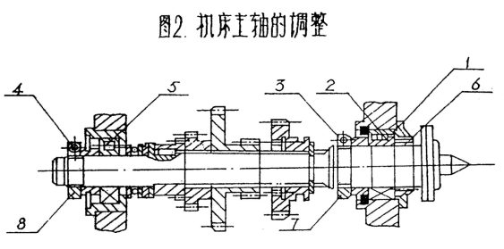 將主軸尾部鎖緊螺母8上的緊固螺釘4松開,沿主軸正轉(zhuǎn)方向稍微轉(zhuǎn)動螺母已使軸承5向右移動減少主軸的軸向間隙。調(diào)整合適后,把螺母8上的螺釘4因緊即可。