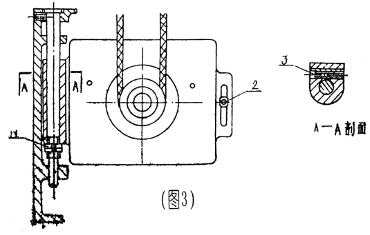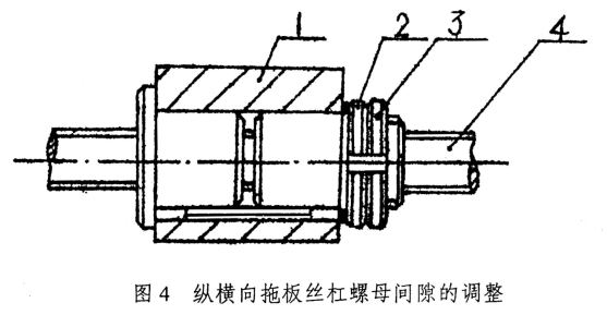 機床使用日久,需要調(diào)整縱(橫)向絲杠一螺母間隙時,首先將螺母3松開,然后稍微轉(zhuǎn)動螺母2,使絲杠右螺母右移即可消除間隙,調(diào)整適當(dāng)后重新并緊螺母3。(見圖4)