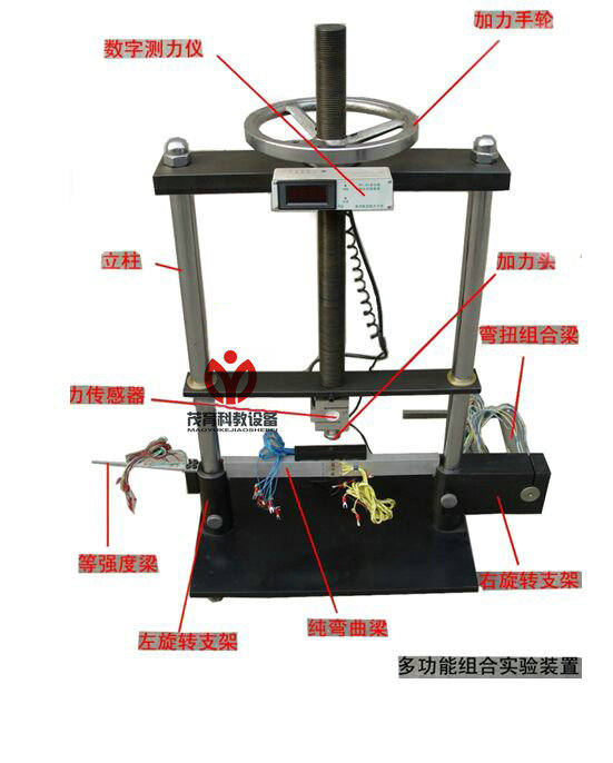7、多功能組合實(shí)驗(yàn)裝置由立柱、底盤、加力手輪、力傳感器、數(shù)字測(cè)力儀、加力頭、左右旋轉(zhuǎn)支架(裝有定位鎖緊螺母),等強(qiáng)度試驗(yàn)梁,純彎曲實(shí)驗(yàn)梁,彎扭組合實(shí)驗(yàn)梁,溫度補(bǔ)償塊等組成。