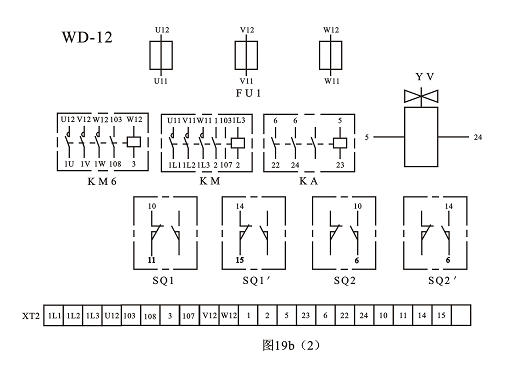SQ1為自動復位的組合行程開關(guān),SQ2為不能自動復位的組合行程開關(guān)。故它們的觸頭用行程開關(guān)的圖形符號來表示。