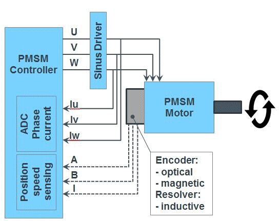 圖1:一個無刷直流電機控制系統(tǒng)需要通過磁性位置傳感器(通常用于汽車領(lǐng)域)或光學(xué)位置在多數(shù)高端應(yīng)用中,無刷直流電動機正在被永磁同步電動機(PMSM)所取代。永磁同步電動機代替了無刷直流電動機中受轉(zhuǎn)矩脈動影響的模塊換相方案,而且能在線圈之間自如切換,減少振動,獲得更高的效率。