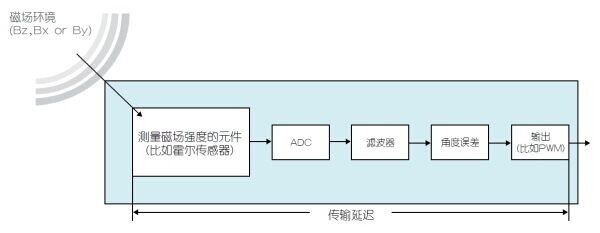 芯片中包含一個信號調(diào)節(jié)與處理回路,將測量出的磁場強度換算為轉(zhuǎn)子的角度位置(以度數(shù)形式)。這一轉(zhuǎn)換所需的時間就是芯片固定的傳輸延遲(見圖2)。不同芯片延遲持續(xù)的時間不等,但當(dāng)今市場上的芯片傳輸延遲通常在10μs到400μs之間。