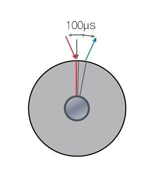 圖3顯示了動態(tài)角度誤差的增加。假設(shè)芯片在轉(zhuǎn)子處于紅線位置時讀取磁場強度,且芯片在轉(zhuǎn)子轉(zhuǎn)動時的傳輸延遲為100μs。當(dāng)芯片將磁場強度換算為角度時,轉(zhuǎn)子用100?s的時間轉(zhuǎn)到了藍(lán)線位置——但芯片向ECU或MCU顯示轉(zhuǎn)子仍在紅線位置。