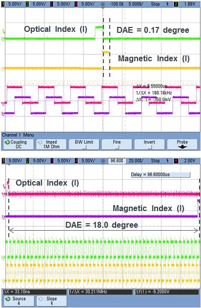 圖5:集成補償方案的傳感器輸出(上)以及未集成補償方案的傳感器輸出(下)圖6顯示了AS5147(左)與傳統(tǒng)磁性位置傳感器(右)測量輸出的區(qū)別,有精確的光學(xué)編碼器輸出作為參考。右圖顯示傳感器輸出受到200μs傳輸延遲的影響,在14,500轉(zhuǎn)每秒的轉(zhuǎn)速下產(chǎn)生的動態(tài)角度誤差為18度。
