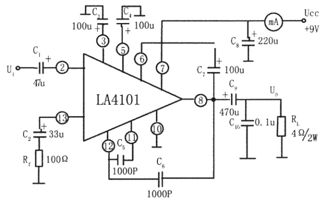 由實驗者自行完成+9V直流電源的接線后,再進行LA4101的功能測試,按圖連接實驗電路。
