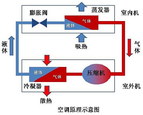 空調(diào)制熱時,氣體氟利昂被壓縮機加壓,成為高溫高壓氣體,進入室內(nèi)機的換熱器(此時為冷凝器),冷凝液化放熱,成為液體,同時將室內(nèi)空氣加熱,從而達到提高室內(nèi)溫度的目的。液體氟利昂經(jīng)節(jié)流裝置減壓,進入室外機的換熱器(此時為蒸發(fā)器),蒸發(fā)氣化吸熱,成為氣體,同時吸取室外空氣的熱量(室外空氣變得更冷)。成為氣體的氟利昂再次進入壓縮機開始下一個循環(huán)。