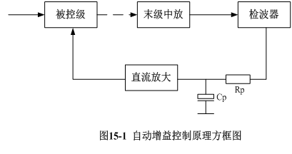 為實(shí)現(xiàn)AGC,首先要有一個(gè)隨外來(lái)信號(hào)強(qiáng)度變化的電壓,然后用這一電壓去改變被控制級(jí)增益。這一控制電壓可以從二極管檢波器中獲得,因?yàn)闄z波器輸出中,包含有直流成分,并且其大小與輸入信號(hào)的載波大小成正比,而載波的大小代表了信號(hào)的強(qiáng)弱,所以在檢波器之后接一個(gè)RC低通濾波器,就可獲得直流成分。AGC的原理如圖15-1所示,這種反饋式調(diào)整系統(tǒng)也稱閉環(huán)調(diào)整系統(tǒng)。