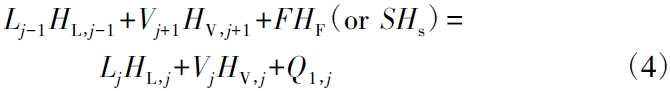 式中:F、S、D 和W 分別為進料量、萃取劑量、精餾塔頂采出量和塔底采出量,kg /h; Lj和Vj分別為第j 塊塔板的液相和氣相流量,kg /h;xi,j和為yi,j分別是第j 塊塔板或j 類液相和氣相中i 組分的質量分率;當j 為非進料級時,F=0。