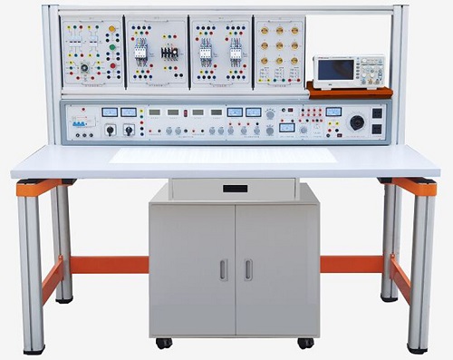 裝置由主機(jī)箱、實(shí)驗(yàn)桌、實(shí)訓(xùn)屏、實(shí)訓(xùn)掛箱、移動(dòng)矮柜、示波器架、學(xué)生凳等組成。實(shí)訓(xùn)裝置支架與實(shí)訓(xùn)桌可組合、可拆裝。支架與桌腳一體,鋁合金結(jié)構(gòu),實(shí)訓(xùn)掛箱、各實(shí)驗(yàn)?zāi)K可根據(jù)實(shí)驗(yàn)需求自由組合放置。