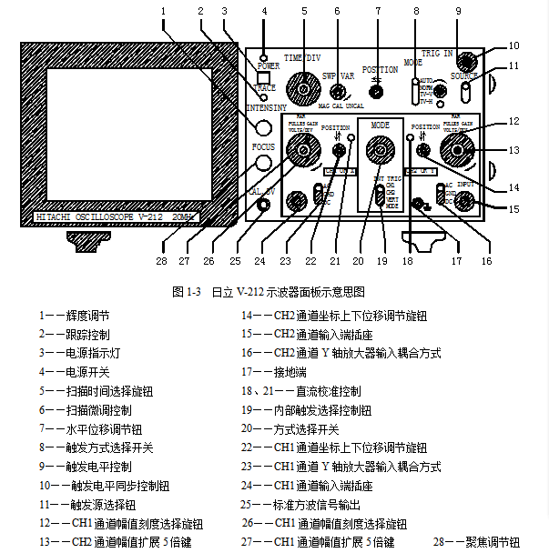 示波器是電子設(shè)備檢測中必不可少的測試設(shè)備,用它可以直接觀察電路中各點的波形,并且可以對信號進(jìn)行各種測量。下面以日立V-212示波器面板為例進(jìn)行介紹。