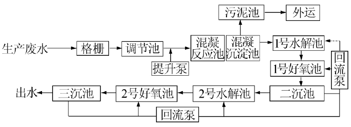 生產(chǎn)采用的染料主要以活性染料、還原染料為主,產(chǎn)生的廢水治理起來(lái)比較困難。該廢水水量波動(dòng)較大,色度、COD、懸浮物濃度均較高,可生化性較差,采用單一的污水處理技術(shù)不能進(jìn)行有效處理。針對(duì)該企業(yè)排放廢水的特點(diǎn),采用混凝沉淀—兩級(jí)生化工藝進(jìn)行處理,以期達(dá)到有效的處理效果。