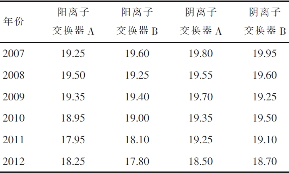 表1 2007—2012 年一級除鹽系統(tǒng)離子交換器運(yùn)行周期統(tǒng)計(jì)