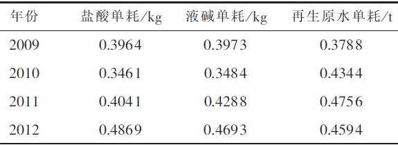 表2 2009—2012 年除鹽系統(tǒng)酸堿及原水單耗