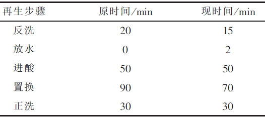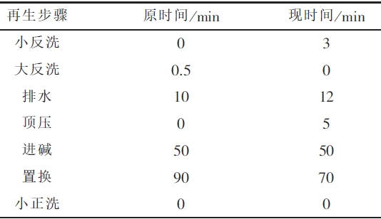 在建立再生智能監(jiān)控系統(tǒng)的基礎(chǔ)上,對離子交換器自動再生程序進(jìn)行優(yōu)化和調(diào)試,調(diào)整了陽離子交換器再生時(shí)反洗、放水和置換的時(shí)間。將陰離子交換器再生時(shí)的大反洗操作改為小反洗操作,同時(shí)增加頂壓操作,調(diào)整了排水和置換的時(shí)間,見表4、表5。
