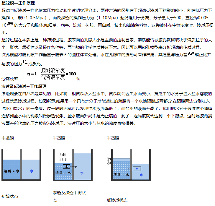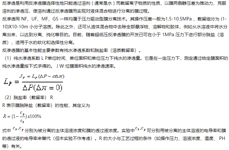 膜分離的作用機理往往用膜孔徑大小為模型來解釋,實質(zhì)上,它是由分離物質(zhì)間的作用引起的,同膜傳質(zhì)過程的物理化學(xué)條件,以及膜與分離物質(zhì)間的作用有關(guān)。