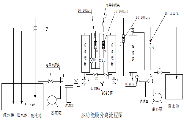 本實驗裝置的分離方法采用超濾、反滲透,其組件為中空纖維膜和反滲透膜。