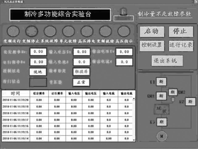 1) 制冷壓縮機(jī)效果差,表現(xiàn)在壓縮機(jī)工作時(shí)冷凝壓力上升和蒸發(fā)壓力下降,而安裝在冷凝器和蒸發(fā)器上的壓力表通過溫度傳感器反饋到計(jì)算機(jī),計(jì)算機(jī)的可視化界面會顯示當(dāng)時(shí)的蒸發(fā)壓力和冷凝壓力,超過設(shè)置的額定值,表明制冷量下降,圖2 為計(jì)算機(jī)控制界面圖形。