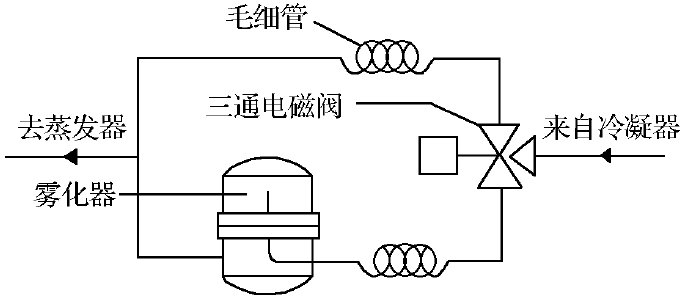 在冷凝器與蒸發(fā)器的管路之間并聯(lián)安裝霧化器,使制冷劑經(jīng)過霧化器,通過三通電磁閥來改變制冷劑流向,完成制冷劑在霧化器內(nèi)的冷凝與蒸發(fā)可視化,圖3為霧化器的安裝圖。此外,研制過程中在制冷系統(tǒng)的關(guān)鍵部位安裝透明石英管路,實(shí)現(xiàn)制冷劑動(dòng)態(tài)可視化。