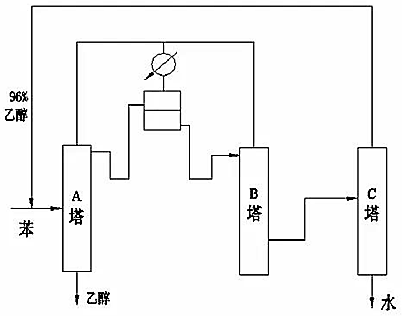 如果雙組分溶液A、B的相對揮發(fā)度很小,或具有均相恒沸物,此時(shí)可加入某種添加劑C(又稱挾帶劑)進(jìn)行精餾。此挾帶劑C與原溶液中的一個(gè)或兩個(gè)組分形成新的恒沸物(AC或ABC),該恒沸物與純組分B(或A)之間的沸點(diǎn)差較大,從而可較容易地通過精餾獲得純B(或A)。