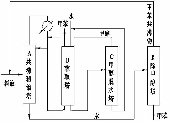 某些雙組分溶液的恒沸物是非均相的,在恒沸組成下溶液可分為兩個(gè)具有一定互溶度的液層,此類混合物的分離毋須加入第三組分而只要用兩個(gè)塔聯(lián)合操作,便可獲得兩個(gè)純組分。
