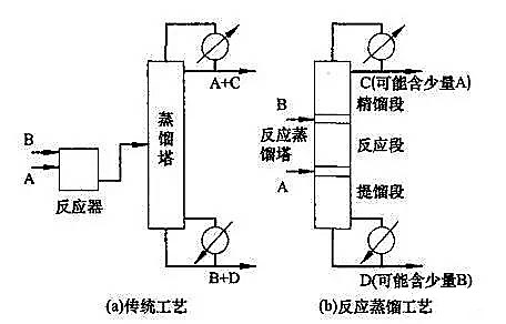 反應(yīng)精餾就是在進(jìn)行反應(yīng)的同時(shí)用精餾方法分離出產(chǎn)物的過程;どa(chǎn)中,反應(yīng)和分離兩種操作通常分別在兩類單獨(dú)的設(shè)備中進(jìn)行。若能將兩者結(jié)合起來,在一個(gè)設(shè)備中同時(shí)進(jìn)行,將反應(yīng)生成的產(chǎn)物或中間產(chǎn)物及時(shí)分離,則可以提高產(chǎn)品的收率,同時(shí)又可利用反應(yīng)熱供產(chǎn)品分離,達(dá)到節(jié)能的目的。