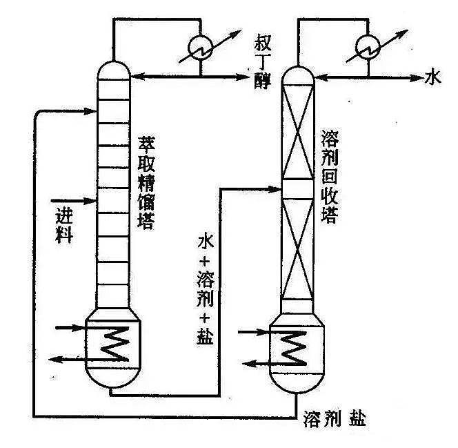 加鹽精餾是向精餾塔頂連續(xù)加入可溶性鹽,以改變組分間的相對揮發(fā)度,使普通精餾難以分離的液體混合物變得易于分離的一種特殊精餾方法。